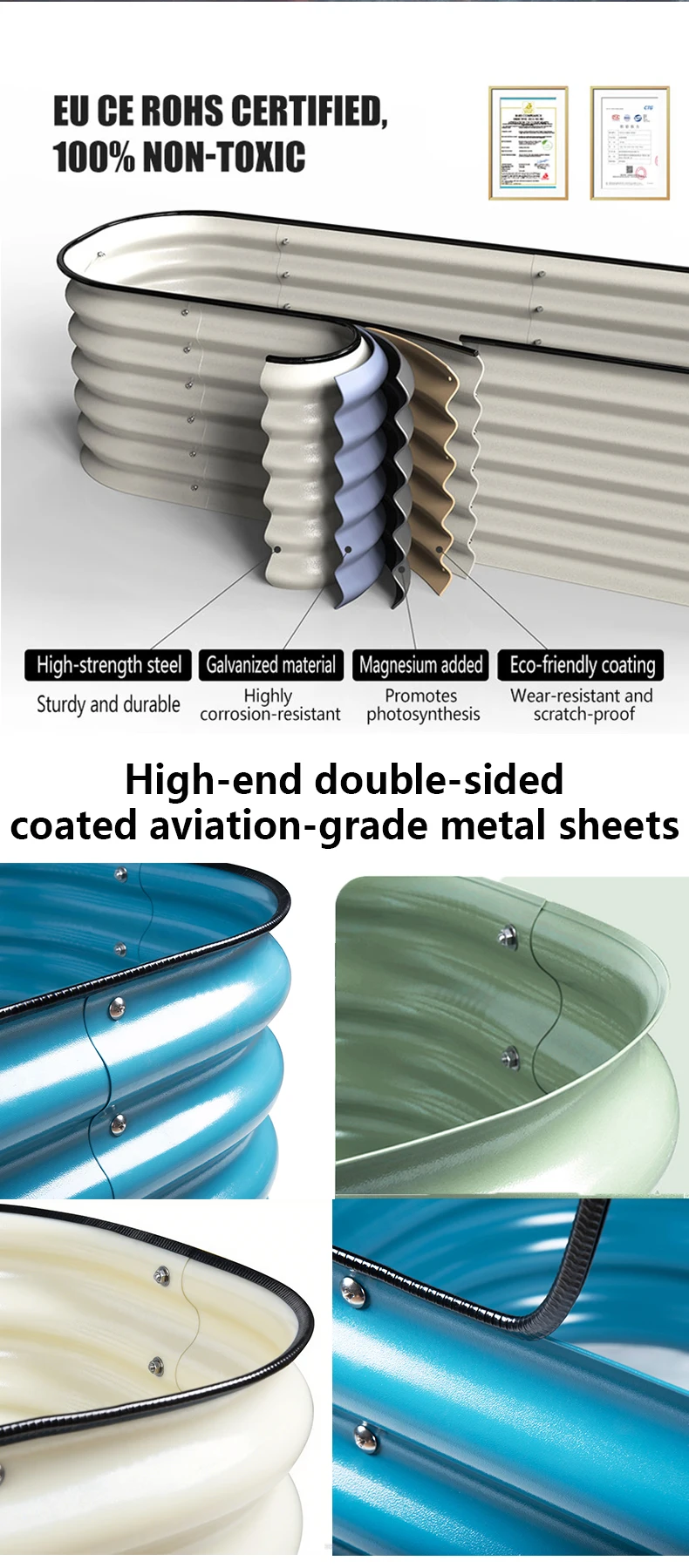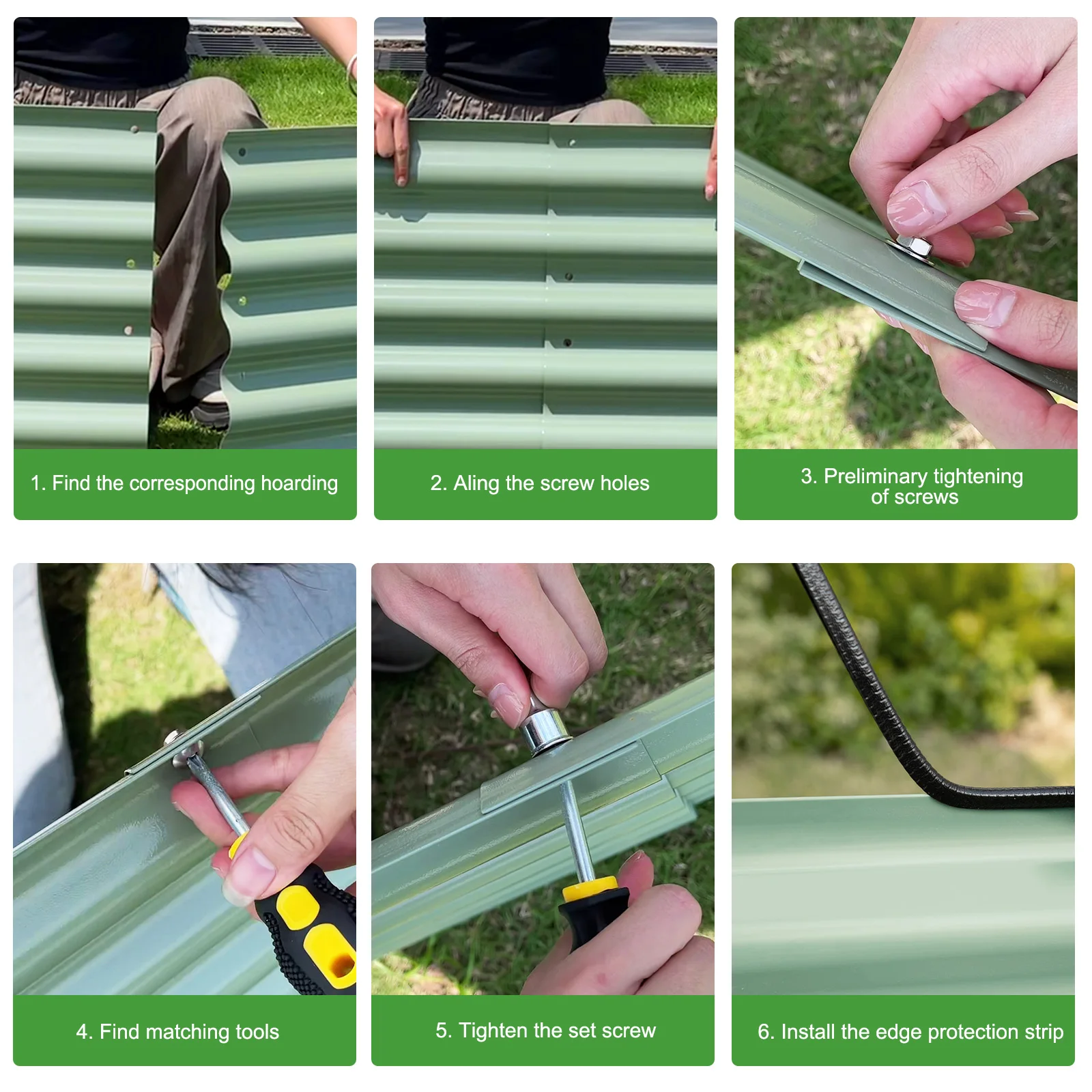 The surface of our products is sandblasted and is not afraid of wear, so there is no need for outer film protection like ordinary planting boxes. Installation speed can be very fast, no need to tear the film, just need put your garden bed together with bolts, nuts and a wrench tool we provide, only requires about a few minutes assembly time.
